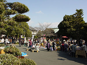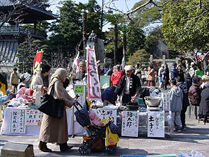 | 初午大祭、多くの人が集う! 楽市大盛況、お茶席は華やかムード 朝6時から開店の準備を始めたのは初登場のやきそば屋さん。長躯、富士宮市からの参加である。新鮮な野菜を売るひとたちも早い。参加店も増え、山門前に2店舗が陣取っている。横断幕に華を添えるようで、楽市の雰囲気はいやが上にもあがる。天気は快晴、気温もこの時期としては穏やかといえよう。 ただ、名物のからっ風がオトナシクしていてくれると、いいが・・・。 早い出足とするどい選択眼 並べる最中から子供たちがおもちゃの品定めに忙しい。店の前を行ったり来たり。子供ばかりかと思ったらご婦人方も野菜の前を動かない。品薄の昨今、野菜を選ぶ目はするどい。熱心なお客さまを前にして売り手も力が入る。今年の特長は食べ物やさん、お菓子屋さんが多いこと。あちこちから湯気が立ち、いい香りが漂ってくる。いよいよ器が温まり、味見が始まった。 「うん、よし!」さぁ、開店準備完了だ。 |