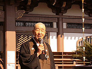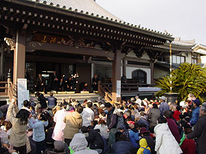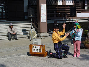 | 「売り手も 買い手も 楽しんで・・」 10時きっかりにご住職のごあいさつ。「年に一回のお稲荷さんのお祭りです。どうぞ、皆さん楽しんでこの日をお過ごしください」、やさしい言葉に各店主の気持ちが高ぶってくる。お客さまの出足はいい。日差しが温かく風さえなければ、ぽかぽか陽気と言いたいが天気予報とは違い、北からの風も結構出てきた。しかし、お客さまの足は途絶えない。 恒例の田中道夫さんによる「大道芸」が子供たちを惹きつける。第一回目の公演である。たちまち本堂前は人の輪ができる。親に背中を押され、「お手伝いに出てきた児」のずった足取りが愛らしい。 |