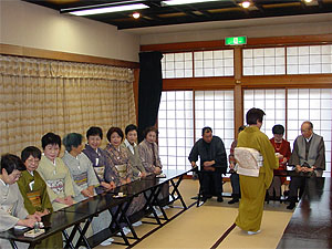 | 天真閣は 華、華、華、 宗徧流のお茶席は正座が苦手でも気軽にお茶を楽しめる立礼と2席が設けられた。 広い待合にはたくさんのお客さまが控え、一度に20人の方がいただける立礼席は人気がある。お着物を召した方も多い。静かな中にも華やいだ雰囲気はあたりの空気を引き締め、且つ心落ち着けるものがある。 表では「いらっしゃい、新鮮だよ!」の声、一歩天真閣に入れば静寂と優雅さ。そこが、天林寺初午の妙、と言えるのかもしれない。 |