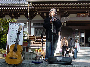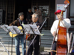 | 寒風、更につよく 午後から冷たい風が強くなる。人手が少し落ちる。例年通りといえばその通りだが、異常に暖かかった数日前を思うと、ひときわ寒さが身にこたえる。 大道芸実演に続き『Fifty Shoulders』が初登場する。自ら「五十肩楽団」と名乗り、肩の凝らない演奏活動を続けておられる“こころ青年”の中年トリオである。2曲目あたりから会場の雰囲気が変わってきた。和やかと言うか、選曲の懐かしさも手伝いゆったりムードが漂い始め、境内の耳目をひとり占めし始めた。その優しい調べとハーモニーの見事さ。ありがとう。「五十肩」さん! |